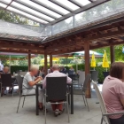 Die Terrasse war wirklich brechend voll an diesem schönen Tag. Sehr schön gelöst: das umlaufende Ständerdächlein schaffte einen Hof welcher durch eine hochliegende beschattbare Verglasung auch bei etwas ungünstigerem Wetter (sehr heiß/sonnig bzw. etwas Niederschlag) einen netten Aufenthalt im Freien ermöglichte. Aber sogar drinnen waren einige Tische belegt. Die insgesamt 2 Damen im Service hatten alle Hände voll zu tun. Und taten dies zügig, professionell und sehr freundlich.