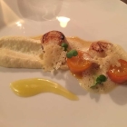 Beide waren wir sehr gespannt auf die Aromenkombination in diesem Gang. Jakobsmuschel liebe ich in jeder Zubereitungsart, Fenchel sowieso, aber diese beiden in Kombination mit Bergamotte (Earl Grey Tea) und Kumquats.....was würde das ergeben? Es ergab einen sehr feinen Teller. Fenchelpüree mit sautierten Kumquats, die Jakobsmuschel gebraten und das Ganze irgendwo mit Bergamotte aromatisiert. Diese Aromen habe ich jetzt noch im Kopf.