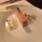 Zweierlei vom Lachs. Einmal sanft mariniert, fast roh. Zweitens eine Art Mille Feuille, in Schichten von Lachs und einer Art Pfannkuchen Teig. Ein bisschen in Orange geschmorter Fenchel, war das ein sehr leckerer Beginn unseres Menüs. Dazu reichte der Service noch Brot und Butter