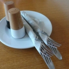 Kurz darauf wurde dann ein Teller gebracht, auf dem Salz- und Pfefferstreuer standen, daneben lagen zwei jeweils in eine Papierserviette eingewickelte Besteckgarnituren. Und lagen.