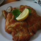 Dann kamen die Schnitzel: Schön dünn geklopftes Fleisch mit einer guten Panierung, die sich von selbst von der Oberfläche des Fleisches löste, geschmacklich sehr gut und auch sehr zart. Jedoch die Größe war nur etwa die eines gleichartig behandelten Schweineschnitzels, dieses Kalbsschnitzel hätte gut und gern 30 – 40 % größer ausfallen dürfen.