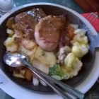 Meine Frau und ihre eine Schwester bestellten die Chefplatte für zwei Personen (je 13,90 €), das gleiche die dritte Schwester mit ihrem Mann. Serviert wurde, wie schon unter Service erwähnt dann eine Chefplatte für vier Personen. Vier Rumpsteaks, vier Cordon Bleu, vier Schweinesteaks, ebenso viele Bällchen Djuvec-Reis, diverse Gemüsesorten, Kroketten, Bratkartoffeln sowie ein Schälchen Ajvar. Die Rumpsteaks garniert mit Kräuterbutter, die Cordon Bleus mit Zitronenvierteln. So war wenigstens beim Fleisch und beim Reis eine gleichmäßige Verteilung möglich. Beim Gemüse mussten sich vier Personen einigen. Einig waren sich alle, dass besonders die Rumpsteaks hervorstachen, sie waren doch tatsächlich medium, wie gewünscht, und schön zart. Cordon Bleu und Schweinesteaks waren in Ordnung. Das Gemüse sehr gut, Bratkartoffeln und Kroketten okay. Alle vier fanden es in Ordnung, wurden pappsatt und insgesamt betrachtet hat es ihnen geschmeckt.