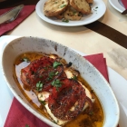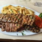 Die Speisekarte ist sehr umfangreich alles was es an griechischen Köstlichkeiten gibt wird hier angeboten. Als Gruß aus der Küche kamen 2 Ouzos und ein Dip mit zwei Schälchen. In dem einen befand sich Zaziki in dem anderen tomatisiertes Olivenöl. Dazu gab es frisches gegrilltes Bauernbrot. Wir fingen anschließend mit einer Vorspeisenplatte (8,00€) an. Eine schöne große ovale, weiße Platte wurde gereicht mit gebackenen Auberginen, Zuccinischeiben, scharfem leckeren Zaziki, Tamar, 2 Oliven und leckeren gegrillten Peperonis. Dazu gab es gegrilltes Brot. Danach wählten wir noch einen cremigen Schafskäse (7,00€) im Ofen gebacken mit Tomatenscheiben, Zwiebeln und wieder gegrilltes Weißbrot. Leider für mich etwas zu ölig. Dann ging es an die Hauptspeise. Der Ouzo-Teller bestand aus 1 Suzuki, 1 Souvlaki, Gyros, 1 Schweinesteak, Ajwar, Pommes Frites und Salat vom Buffet (15,00€). Das Fleisch war sehr zart obwohl es durchgebraten war. Das Gyros zart und vermutlich gewürzt. Es war nicht zu schmecken wo eine leichte Schärfe herkam, die aber angenehm war. Das Ajwar scharf war dann der Gegensatz. Die Pommes schön groß und innen schön weich. Der Salat vom Büffet konnte sich jeder selbst zusammenstellen. Angeboten waren: Karotten, Blattsalat, Peperoni, Mais, Tomaten, Weißkraut sowie 2 verschiedene Saucen die mir aber zu wenig Salz enthielten. Alles frisch zubereitet.