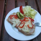 Nahezu umgehend erhalte ich dann eine fast zwei Zentimeter dicke Roggenbrotscheibe mit noch leicht krossem Rand, ordentlich Wild-Griebenschmalz drauf und entsprechender Musik aus massig hauchdünnen Zwiebelringen und Paprikastreifen. Ein Tomatenviertel, etwas Gurke und Salat begleiten das Ganze.
