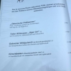 Jetzt kann ich mich auf die Auswahl des Hauptgerichts konzentrieren. Es klingt alles so lecker, daher habe ich die Auszüge aus der Karte abfotografiert. Und da ist sie wieder, die Rathmannsdorfer Forelle. Um das Desaster von gestern zu annihilieren bestelle ich sie Aufgrund des Vorwortes – heute in der Zubereitung „heißgeräucherte Lachsbachforelle“ (12,50 €). Geordert wird umgehend mitsamt einem zweiten Weizen.