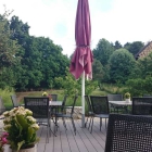 Die Außenterrasse auf der Rückseite des Hauses, mit schöner Bestuhlung, Bänken aus Holzstämmen. Blümchen auf dem Tisch. Schattenspender sind vorhanden. Die Sitzflächen mit Paneelen belegt, drum herum kleine Steine (in die der freundliche Raucher seine Kippen fallen lässt, warum? Diese werden sicherlich mühevoll vom Personal abgesammelt).