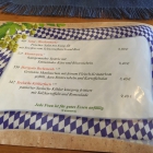 Die Speisekarte ist ein kleines bunt bedrucktes Heftchen auf bayrisch getrimmt mit Rautenmuster und Hopfendolden. Verschiedene Sprüche befinden sich auch mit dabei. Sie ist sehr Fleisch lastig. Ohne Fleisch gibt es Käsespätzle und einmal Fisch.