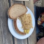 Der Wurstsalat kostete 5.-€, war eine schöne Portion, die Leoner dünn aufgeschnitten und hatte einen guten Geschmack. Dazu gab es rote und weiße Zwiebeln und zur Deko frischen Schnittlauch, ein Stück Gurke und Tomate. Der Sud hatte eine schöne Essignote, mit Pfeffer aus der Mühle nachgewürzt und er war gut. Die halbe Scheibe Bauernbrot war frisch , schmeckte gut,war aber etwas wenig für die Menge Wurstsalat .
