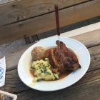 Es gab eine Scheibe Brot dazu die wir auch zum anderen Gericht dazu bekommen hatten. Es war frisch, innen weich und der Rand nicht so knusprig, geschmacklich haben wir auch schon ganz andere Brotscheiben bekommen. Sehr einfach nichts besonderes im Geschmack . Die Wurst war lecker im Geschmack, schön würzig mit Kräutern verfeinert. Wir würden sie in der Tendenz auf eine Thüringer einordnen. Sie war auch schön angebraten. Einen Klacks Senf gab es auf dem Teller mit dazu, mittelscharf und was ganz normales. Das Kraut war ein wenig eingekocht, leichtes Säurearoma kam durch und es wurde mit Kümmel verfeinert.
