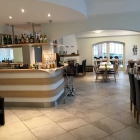 Zum Äußeren des Hauses ist oben das Wichtigste gesagt. Das Restaurant liegt großräumig im Erdgeschoß neben der Rezeption, eine Bar ist im Restaurant integriert. Wände, Decke, Fußboden und die Möblierung sind bis auf die Sitzgelegenheiten in weißen, hellbraunen oder -grauen Tönen gehalten, die Stühle kontrastierend mit dunklen Sitz- und Lehnenbezügen und die Sessel mit schwarzen Kunstlederbezügen. Der Fußboden ist großflächig gekachelt, grau-weiß-bräunlich. Nüchtern wirkt der Raum, nicht ganz so nüchtern wie ein moderner Kantinenraum. Aber der hallenartige Charakter, die nüchterne Ausstattung erinnern eher an ein geschäftsmäßiges Ambiente denn an Kur-, Wander- oder Erholungsurlaub.