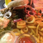 Die kleine Lady kam mit der Karte angewackelt, A4 laminiert, sehr liebevoll gestaltet und größer als erwartet (die Karte!). Hier zeigt sich eine schöne Auswahl von durchweg Elvis-kompatiblen Frühstückstellern (Ahornsirup, Pancakes, Bacon, baked Beans, Eier in allen Varianten), Fingerfood, etwas Pasta, einige Tellergerichte und natürlich Burger, letztere in einer erfreulichen, zum Teil sehr authentischen Bandbreite mit Angus Rind und passenden Buns (u.a. Brioche und einer dunklen Guinness Spielart).