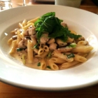 Meine Pasta waren al dente gekocht und mit einer gebundenen weißen Cremesauce zubereitet. Die länglichen Fleischstreifen waren trocken und zäh. Mir kamen Zweifel, ob das Fleisch vom Schweinefilet war. Einige dünne Scheiben Champignons und wenige Lauchzwiebelringe brachten etwas Geschmack an die Speise.