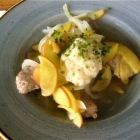 Sowohl bei der Essensbestellung als auch beim Servieren muss man heute lange Wartezeiten in Kauf nehmen. Das Genusswerk ist an diesem Tag einfach bis zum letzten Platz belegt und kommt deutlich an seine Kapazitätsgrenzen. Doch wenn die Speisen erst mal auf dem Tisch sind, ist man förmlich entzückt vom Arrangement und der gelungenen Darreichung. Noch nie habe ich derart adrett angerichtete Blaue Zipfel gesehen (für sehr angemessene 7,80 Euro). Die Bratwürste dümpeln in einem fein säuerlichen Zwiebelsud und werden von pikanten Apfelscheiben und Häufchen von pikantem Kren begleitet. Auch die kleine Käse-Auswahl für 9,50 Euro wird fein herausgeputzt auf einem Holzbrettchen serviert – der Blauschimmelkäse, der Romadur und der Butterkäse haben für sich schon derart intensive Aromen, dass Trauben und Radieschen zwar noch wunderbar passen, der scharfe Feigensenf aber geschmacklich schon zu überdimensioniert daherkommt. Den esse ich zum Abschluss einfach mit der vielfältigen Brot- und Brötchenauswahl, die uns begleitend zum Essen gereicht wird.
