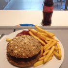 Der Hamburger und der Cheeseburger sind beide ordentlich belegt. Man bekommt keine Maulsperre aber man wird satt. Zur Auswahl stehen im übrigen Vollkornbrötchen und Weizenbrötchen. Bei mir fiel die Wahl auf das Vollkornbrötchen, was denke ich die richtige Wahl war (siehe auch Bild). Das Fleisch ist zart und saftig, passt perfekt zum Brötchen und der Salat und die Soße runden den Burger ab.