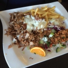 Letztlich kam dann eine Platte – die ich schon zuvor an der Theke beim ausstellen gesehen hatte und meinte, dass da eine Familienplatte gemacht wird – eine Portion Bulgursalat – sehr sehr lecker samtig saftig, nur sehr leicht scharf abgeschmeckt, ein Krautsalat - frisch gehobelt und gewürztes leichtes Dressing direkt am Kraut, ein anderer Salat unter massiven Joghurtdressing versteckt- werden wohl fein gehobelte weiße Gemüsezwiebeln gewesen sein ,dazu ein Schlag Pommes und sehr viel und sehr fein gehobeltes Dönerfleisch . Nicht so schön machte sich das offensichtlich als Deko gedachte Orangenachtel, das wohl schon länger auf Einsatz wartete und darob unter der Warmhaltelampe vertrocknet war.