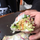 Bei der Füllung waren wir jetzt nicht so zufrieden. Die Reisnudeln waren sehr weich gekocht und das Hühnerfleisch etwas spärlich vertreten und gut durch. Die Erdnüsse wurden klein gehackt mit bei gemischt. Beim Gemüsesalt kamen wir und vor als hätten wir einen Döner in der Hand. Klein geschnittener Eisbergsalat, Radicchio, Gurken -, Zwiebel -und Gelberübenstreifen- . Ein Blättchen Koriander konnten wir auch finden. Alles Natur pur. Das war jetzt für uns keine Sommerrolle so wie wir sie kennen.
