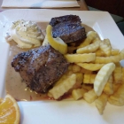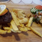 Diese Steaks wurden nicht medium, sondern "durch" bestellt. Und kamen auch so zum Gast, ohne trocken oder gar zäh zu werden. Ich durfte die Soße probieren - perfekt. Cremig, guter Geschmack nach Pfeffer, auch leichte Schärfe, so soll es sein. Über die Sahne kann man streiten, aber die Idee ansich ist brauchbar. Die Steaks bestanden aus einer Schnitte vom Kalbsrücken und einer Schnitte vom Rind. Meiner Meinung nach aus der Nuss.Der Preis hierfür: 13,80 €.
