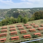 Über einen Selbstbedienungsbiergarten geht es in das Restaurant mit Service. Eine nette junge Dame nahm uns in Empfang und bot uns tatsächlich noch einen Platz auf der Terrasse an. Tritt man aus der Tür auf die Terrasse, erblickt man über eine Wiese hinweg die Loreley.