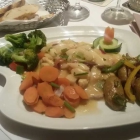 Die Scaloppina mit Spargel bestanden aus 3 dünnen Scheiben Schweinerücken, klein geschnittenem weißen Spargel (geschätzt etwa 4 Stangen), Brokkoli, Karotten, "Bratkartoffeln" und Weißweinsoße.