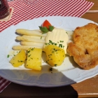 Auch auf unsere Hauptspeise mussten wir nicht lange warten, war diese dann auch schon nach knapp 30 Minuten am Tisch. Zur Mittagszeit in einem vollbesetzten Biergarten. Hut ab, da rotiert die Küche. Da wir beide Spargel lieben, gab es ja für uns keine andere Wahl, und wir wurden mit unserem frischen Spargel mit Schnitzel, Kartoffeln mit Sauce Hollandaise nicht enttäuscht.