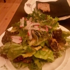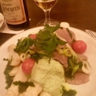Zum Hauptgericht wurden Blattsalate in einer hausgemachten Cocktailsauce serviert, die leicht pikant war. Die Salatblätter - Eisberg war nicht dabei - waren untadelig frisch, hätten aber vielleicht einen Tick kleiner sein dürfen. Schwieriger noch, dass auf dem schon beachtlichen Turm frische Radieschenschnitze, Kresse und Petersilie drapiert waren. Konzentration war gefragt.