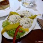 Vorab - und das ist für ein griechisches Restaurant ungewöhnlich - gibt es einen kleinen Appetitanreger aus der Küche: Zwei leicht angeröstete Stangenbrotscheiben mit einem Dip aus Weißkohl, der sahnig mild angemacht war. Ein paar Tropfen Olivenöl und ein Hauch von Knoblauch erinnerten sehr fern an griechische Würzung.