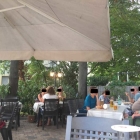 Zum Nachbarn hin ist es begrünt und Bäume spenden an einem kleinen Bereich ein wenig Schatten. Für weiteren Schatten gibt es einen Schirm , der aber nicht für alle Tische ausreicht.