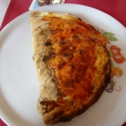 Nach angemessener Wartezeit wurden die Pizzen serviert, wobei meine Calzone einige schon sehr dunkle, verbrannte Stellen aufwies. Die Pizza des Kollegen sah recht gut aus und wurde von ihm auch als geschmacklich gut bewertet. Für meinen Geschmack war der Teig der Calzone, insbesondere an den Stellen, wo Ober- und Unterseite zusammen gedrückt waren, deutlich zu dick und auch trocken. Die Füllung aus Schinken, Salami und Pilzen hatte wohl sowieso kaum Eigengeschmack, es wurde überlagert von dem Käse, bei dem es sich vermutlich um einen Schmelzkäse mit Chili-Geschmack handelte, denn es waren kleine rote Pünktchen darin enthalten. Das sollte wohl die deklarierte Schärfe ausmachen, die aber nicht wirklich vorhanden war.