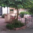 Als wir dann am frühen Abend am Ochsen in Wittelsbach ankommen müssen wir erst gar nicht durch das Gasthaus gehen. Man kann von der Seite über einen hübschen Nebenzugang einen wunderbaren Garten betreten. Links geht es über eine kleinen Hof nach innen, rechts finden sich auf einer kleinen Terrasse ein paar Tische und weiter hinten gibt es unter alten Bäumen noch weitere, schön eingedeckte Tische. Ich habe zwar versucht dieses an südenglische Gärten erinnernde Ambiente auf den Bildern einzufangen, in echt sieht das aber noch bei weitem schnuckeliger aus.
