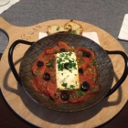 Eine Zwiebelsuppe und den gebackenen Schafskäse auf dem Ofen vorweg, Spaghetti von der Tageskarte für meine Frau, den Steakspieß von der festen Karte für mich.