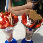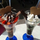 Die Kinder wählten Crepes mit Vanilleeis und Bananen, Crepes mit Vanilleeis und Erdbeeren, Schokoeisbecher mit Erdbeeren, sowie einen Jogurettebecher. Jedes Kind bekam noch eine heiße Schokolade. Meine Frau bestellte ebenfalls einen Schokobecher mit Erdbeere und einen Latte Macciato, ich wählte den Erdbeereisbecher und ebenfalls einen Latte. Die heiße Schokolade war sahnig und sehr schokoladig, der Latte typisch italienisch cremig. Die Crepes frisch zubereitet und warm, die zufriedenen Gesichter der Kinder zeigten auch an das diese wohl schmecken mussten. Das Eis italienisch sahnig, cremig-einfach ein Traum. Die Erdbeeren frisch und bissfest. Von daher nichts zu meckern. Die Preise liegen zwischen 5 bis 8 Euronen für einen Eisbecher, die Crepes liegen preislich etwas darüber. Der Latte mit 3 Euronen und die Trinkschokolade ebendso im preislichen Borkumer Mittel.