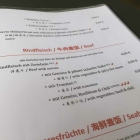 Es gibt hier eine einfache braune Speisekarte mit den üblichen Klarsichtfolien. Es ist eine große Auswahl vorhanden, aber irgendwie etwas ungewöhnlich zum lesen. Schärfe wird hier durch Chilischoten angezeigt. Zum Teil wurden bei Gerichten die Blätter nicht ausgetauscht sondern mit einem schwarzen dicken Stift verändert. Es gibt auch ausgefallene Gerichte wie Schweineohren oder Entenfüße. Es sind auch nicht die Gerichte wie bei so vielen Asiaten, es gibt ganz andere Zusammenstellungen.Gerichte gibt es auch zum mitnehmen.