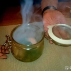 Danach stellte uns Pierre Hartung schelmisch grinsend ein geschlossenes Einmachglas auf den Tisch und erklärte uns kurz seinen Inhalt. Den sah man noch nicht, da es im Inneren zuging wie in einem von Kunstnebelschwaden geschwängerten Raum einer Grufti-Disko. Erst nach dem Öffnen der „Rauchbombe“ trat das auf eingekochter Haferflocken-Waldpilz-Jus thronende Onsen-Ei zu Tage. Laut Serviceleiter wurde es ca. eine Stunde lang bei 64 Grad im Konvektomat auf seinen Kurzauftritt im Einmachglas vorbereitet. Dass da viel Rauch um wenig Ei war, störte nicht im Geringsten. Es war mein erstes Onsen-Ei und genau wie GG-Kollege Daueresser war ich von seiner fluffigen Konsistenz begeistert. Zusammen mit dem erdigen Pilz-Geschmack und der leicht säuerlichen Haferflockenmasse war das ein ganz besonderes, sehr eigenständiges Geschmackserlebnis, das etwas an die Esslandschaften der nordischen Küche erinnerte, wenn auch nur in der Miniaturausgabe. Um den Onsen-Eier-Hype zu relativieren, muss ich gestehen, dass ich mir dieses Gericht wohl kaum als Vorspeise bestellt hätte. Aber als Zwischengang bei herbstlich angehauchter Menüfolge hatte das schon seine Berechtigung. Dass dieses geräucherte Ei in der Zwockelsbrück mittlerweile „Signature-Dish-Status“ genießt, kann ich in Anbetracht der anderen Preziosen aus der Niederbremer’schen Küche nicht ganz nachvollziehen. Aber sei es drum, interessant geschmeckt hat das Ding allemal.