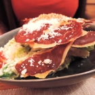 Gang eins war dann gleich mal eine Augen- und Gaumenweide. Saftige Tranchen von der geräucherten Gänsebrust – natürlich mit dem obligatorischen Fettrand – machten aus dem mit einer süßlichen Vinaigrette angemachten Feldsalat etwas Besonderes. Da fügten sich auch die roten Granatapfelkerne, die zusammen mit ein paar Tupfern aus Fruchtmus für farbliche Verwirrung beim rot-grün blinden Esser sorgten, harmonisch in das Geschmacksbild ein. Ein famoser erster Gang, der dieses Herbst-Menü schmackhaft eröffnete.