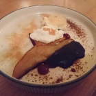 Herrlicher (Weich)Käse, hübsch mit Gewürzen in Szene gesetzt - mit der Frucht und der leckeren Marmelade. Eingelegter „Käs Käs“ wie wir in der Pfalz dazu sagen, dazu noch ein Stück fester weißer Käse mit Zwiebelringen und einem großen Brotchip. Ein paar kleine Scheibchen Brot wäre dazu echt ein Traum gewesen, leider kam nix. Aber der Käsegang ein echtes Highlight. Wir riefen die eine etwas erfahrener wirkende Bedienung her. „Der Käsegang müsste eigentlich mein 5. Gang gewesen sein, ich hatte nur drei, plus den einen den sie mir nach dem Fleisch gebracht haben. Wäre es möglich, dass ich auch das Dessert bekomme ?“. Ich schließe mich der Frage gleich an, denn ich zeigte auf meinen schlanken Bauch. Sie erklärte wir würden alle vier ein Dessert bekommen, die beiden mit der Weinreise bekämen auch noch ein Glas Wein. Das war dann doch noch eine nette Aufmerksamkeit, mit dem abschließenden Dessert hatten wir dann 6 (Mini) Gänge mit 6 Gläsern Wein. Das Dessert