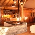In dem neuen Gebäude im alpenländischen Stil mit sehr viel Holz fühlt man sich schon nach dem Eintritt wohl. Eine warme, anheimelnde Atmosphäre wir durch eine geschickte Aufteilung des eigentlich komplett offenen Raumes erreicht. Gleich rechts neben dem Eingang findet man den „Hofladen“, eine kleine Theke mit dem selbst erzeugten Käse und Wurstwaren animiert zum Kauf. Gegenüber hinter einer Glasabtrennung die kleine Schau Bierbrauerei mit den blinkenden Kupferkesseln und Leitungen die sich optisch bis zur Theke und den Bierzapfhähnen hinzieht. Mitten im Raum dann die „Schaukäserei“. An einem Kamin eine offene Feuerstelle und darüber der kupferne Käskessel – ein Hingucker! Hier wird dann auf Voranmeldung jeden Freitag ein traditionelles Schaukäsen am offenen Feuer veranstaltet. Jeden Donnerstag übrigens Brauereiarbeiten mit Schlachtpartie und Kesselfleisch.