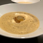 Der Aufwand für den folgenden Gang ist mehr als überschaubar. Die Rose aus roher Jakobsmuschel und Birne ist bereits auf einer Geleehaube vorgeformt und wird nur in einem warmen Teller mittig platziert und dann mit der erwärmten und aufgeschäumten Hummersuppe angegossen.