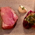 Bereits mit dem ersten Gang begeisterte die Küche. Die Kombination von fantastischen, in Moscovado-Zucker getrockneten Erdbeeren, unterschiedlichen wunderbar aromatischen Tomaten und einem kräuterigen, ganz eben pikanten Schnittlauch-Sud wurde von festem, nicht zu fettem Aal verbunden und klang erst verrückt. Tatsächlich brachten die sich entwickelnden Komponenten einen zwar kräftigen, aber unerwartet harmonischen Geschmacksakkord zustande. Luftige, an Langos erinnernde Bällchen sorgten für den Knusper. Klasse!