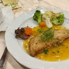 Eine der Damen bringt die Hauptgerichte. Auf dem Teller für meine Frau liegt neben einem angebräunten Meerbarbenfilet in gelb-orangefarbiger Chilisauce die Gemüsebeilage, bestehend aus Broccoli, Blumenkohl, Romanesco und einem Möhrenstückchen. Als Dekoration dienen ein Möhrensternchen, ein Salatblättchen und auf der Meerbarbe ein Dillzweig. Getrennt in einer kleinen Porzellanschüssel werden die Wasabi-Kartoffeln serviert.