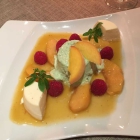 Jetzt war mir nach einem Dessert. Die Wahl fiel auf Basilikum-Panna-Cotta mit Pfirsich-Himbeer-Kompott. Schon der Anblick ein Bild für Götter. Dieses Dessert passte hervorragend zum Fisch.