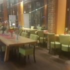 Die Onlinereservierung vorab funktionierte Problemlos, und so konnten wir nach einer ewigen Parkplatzsuche unseren Platz einnehmen. Zu unserem Erstaunen wurde trotz halbleeren Lokal jeder weggeschickt der nicht vorab reserviert hatte. Dies dient wahrscheinlich der Kontakterfassung, hat man ja so Namen und Adresse, denn diese wurden nicht noch einmal abgefragt. Wir saßen schräg gegenüber der offenen Küche, und konnten dem Küchenpersonal bei ihrer Arbeit zuschauen. Die Stühle und Bänke sind mit weichem Leder, welches mit einem großen Firmenschriftzug versehen war. Es saß sich gemütlich, da wir aber auch in der Nähe der Tür saßen, zog es manchmal und die Damen fröstelten.