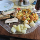 Also bestellte ich den gebratenen Hornhecht mit Bratkartoffeln à 9,70 Euronen, für Madame durfte es immerhin ein Salat mit Hähnchenbruststreifen zu 7,60 Euronen sein. Da wie bereits erwähnt, das Ganze als ‘one-woman-show‘ läuft und mittlerweile einige Bestellungen an Fischbrötchen, Kaffee und Kuchen etc. vorlagen, dauerte es ein wenig. Es war aber hochinteressant zu beobachten wie souverän die Alleinköchin/-kellnerin dieses massive Gastaufkommen bewältigte. Den gestiegenen Stresspegel konnte man allerdings sehr gut an ihrer gesteigerten Atemfrequenz, untermalt von einem regelmäßigen, kräftigen Prusten ablesen. Trotzdem blieb sie dabei rustikal freundlich und dachte auch mit. So gab es einen Extrateller für die grünen Gräten des Hornfischs und riesige Salz, Pfeffer und sogar Chilimühlen.
