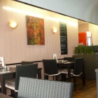 Das tat ich dann auch als einziger Gast und schaute mich um. Alles sieht relativ neu aus, ein schlichtes, sachliches Ambiente, ansprechend möbliert, mit Schiefertafeln an den Wänden, auf denen die kulinarischen Angebote für den Mittagstisch festgehalten waren, überwiegend gutbürgerlich und mediterran orientiert. Es gab u.a. auch „Endivien untereinander mit Blutwurst“ (6,50 €). Ich wollte noch fragen, was das sein könnte, habe das dann aber doch vergessen. Samstags gibt es auch indische Spezialitäten (der Koch ist Inder), aber danach war mir heute nicht.
