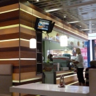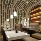 Das kleine Restaurant ist recht futuristisch und trendig gestaltet, unter einer bogenartig geformten weißen Decke ist ein Meer aus Algenblättern angebracht, es gibt mehrere Sitznischen, die teils mit Vorhängen aus kleinen Stahlkugeln voneinander getrennt sind, so wird trotz wenig Platz ein gewisse Privatheit vermittelt – nicht übel für ein Schnellrestaurant.