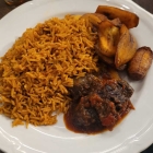 • 1x Jellof Rice with Plantain & Beef – Roter Reis mit frittiertem Fleisch in einer Soße aus frischen Tomaten und frittierten Kochbananen für 17,00 €