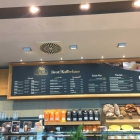 Beim einen Eingang kommt man gleich zum Verkaufstresen. Hier sind auch die Gerichte oben drüber auf einer Tafel hinterlegt. Es gibt Pizza, Brotzeit, Salat und Frühstück.