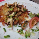 Kartoffelrösti mit frischen Champignons zu € 7,90 und ein Beilagensalat zu € 3,50.
