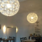 Fast quadratisch hat er eine große Höhe. Später schaue ich mir das Gebäude näher an. Es handelt sich um einen lang gestreckten Wohnblock, wohl der frühen 60er Jahre. Die kurze Seite steht an der Straße. Vielleicht war hier ein Gesellschaftsraum der Wohngemeinschaft. Der Innenarchitekt oder die Architektin hat sehr gute Arbeit geleistet. Weiße Wände, graubrauner Holzfußboden, helle Holztische. Die von mir wenig geschätzten Schlabberplastiksets in Flechtoptik und die dunklen Holzstühle mit roten Lederflächen setzen dunkle Akzente. Wenige Wandlampen, über die weiße Küchentücher geworfen sind (Hip, Hip). Einige aufgezogene Fotografien mit norddeutschen Küstenmotiven setzen das Thema Deych bzw. Strand um. Dazu passen wenige zurückhaltende maritime Accessoires auf den Fensterbänken. Vor den Fenstern einzelne rote Gerbera, auf den Tischen je eine kleine gelbe Rose, das sind die wenigen echten Farbtupfer im Raum. An einer Wand kaschiert eine übergroße schwarze Tafel die Raumhöhe. Geschrieben steht daran noch nichts. Doch die aktuelle Homepage preist Fleisch bzw. Fang des Tages "von der Wandtafel" an; es ist also im Werden. (Übrigens droht die HP auch, dass man demnächst etwas über "unseren Koch Tobi" und dessen "Philosophie" erfährt...) Gegenüber hängen als echte Hingucker drei große, wirklich große Besteckteile an der Wand. Und von der Decke schweben zwei große Schneeflocken, die mit warmem Licht wunderschöne Schattenspiele an die Wände zaubern. Obwohl der Raum so hell ist, wirkt er überhaupt nicht kalt. Ein großer Tisch in der Mitte ist für eine Gruppe auch mit Weingläsern eingedeckt. Das Besteck ist solide Gastroware. Ansonsten stehen auf den Sets nur umgedrehte Wassergläser, naja, nicht ganz die feine Art. Außerdem findet sich auf den Tischen in einem weißen Porzellanständer eine elegante Kerze, die von der Kellnerin auch gleich entzündet wurde, nachdem ich Platz genommen hatte. Ich empfand das Ambiente als völlig stimmig und habe mich als Einzelgast sehr wohl gefühlt. Die 5 Sterne werden durch ein Detail verhindert, das mich mal wieder sprachlos machte. Setzen sich die Wirte eigentlich nie gemütlich auf ihre Stühle? Die hinteren Stuhlbeine sind hochgezogen und bilden den Rahmen der Rückenlehne. Die Streben sind aber nach hinten gesetzt, so dass man (d. h. ich) daran gar nicht lehnt, sondern an den Kanten des Rahmens. Auf die Dauer ist das Folter. Wer denkt sich sowas aus?