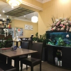 Die Wände hier sind gelb gestrichen und es gibt eine Holzverkleidung. Bilder und Fächer zieren die Wände. Die Bestuhlung besteht aus dunkleren Stühlen im asiatischen Stil mit rot gemusterten Sitzbezügen. Auch ein Aquarium mit Goldfischen ist hier vorhanden.