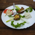 Als Gruß aus der Küche gab es zunächst einen kleinen Teller mit einer Tomatenspalte mit Mozzarella, gegrillte Auberginenscheibchen, Rucola, kleine Lauchstreifen und eine tolle gut gewürzte Mayopaste mit frischen Kräutern zum Dippen.